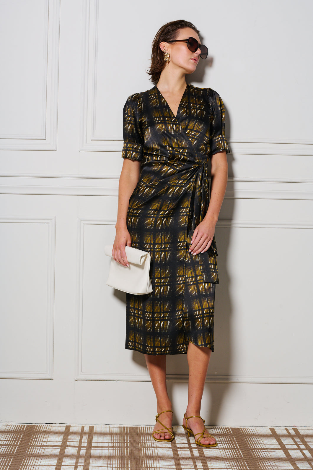 Featuring an easy wrap tie and sleeves that made be worn rolled up with cuff or wear down for a below elbow length sleeve. The workmanship is incredible with all internal french or bound seams. This dress is mid calf length (model is tall) and looks great with kitten heel or slide for more casual dressing.