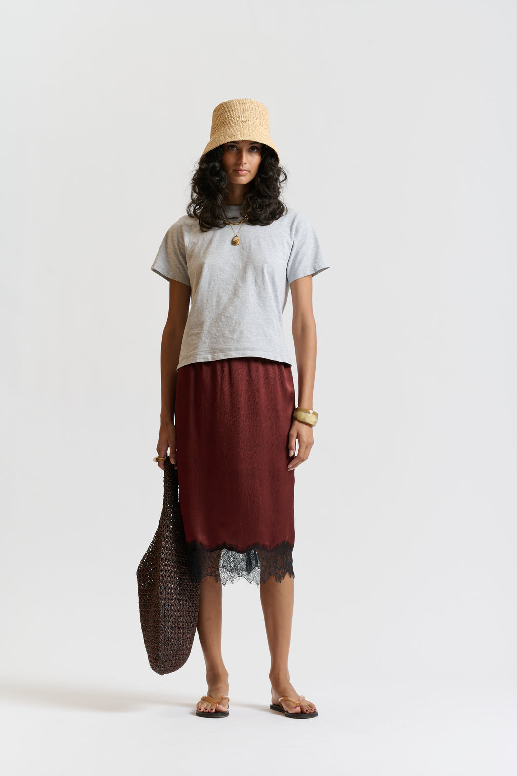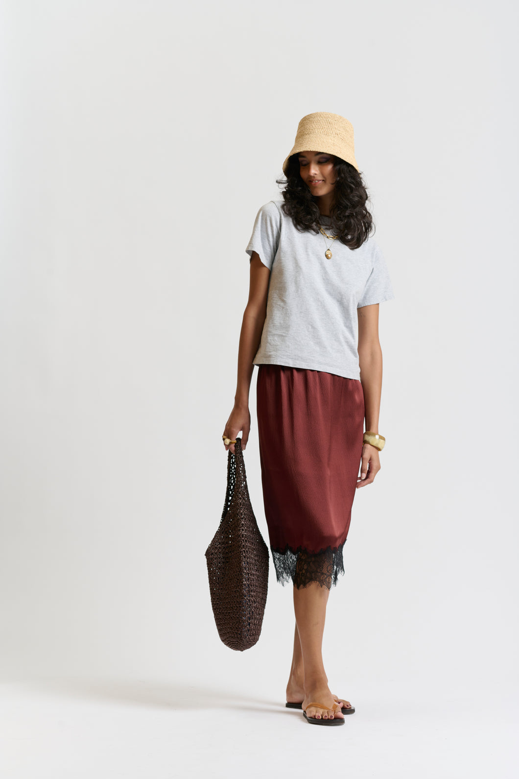 This gorgeous easy pull on skirt is made from hammered silk with lace trim and centre back split. It looks great dressed down with an easy relaxed tee or tank and your favorite thongs or slides. Dress up with kitten heel for going out.
